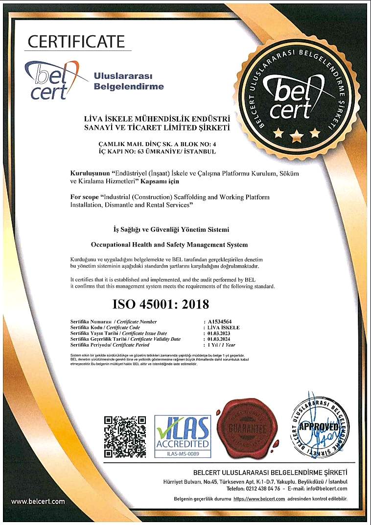 Liva Scaffolding uses scaffolding material certified in accordance with EN12810-EN12811 norms produced in international standards. Liva Pier, which realizes all stages with the vision of plan-build-manage all our projects with its expert staff in its field, leads the sector by showing maximum attention to HSE rules during its activities.